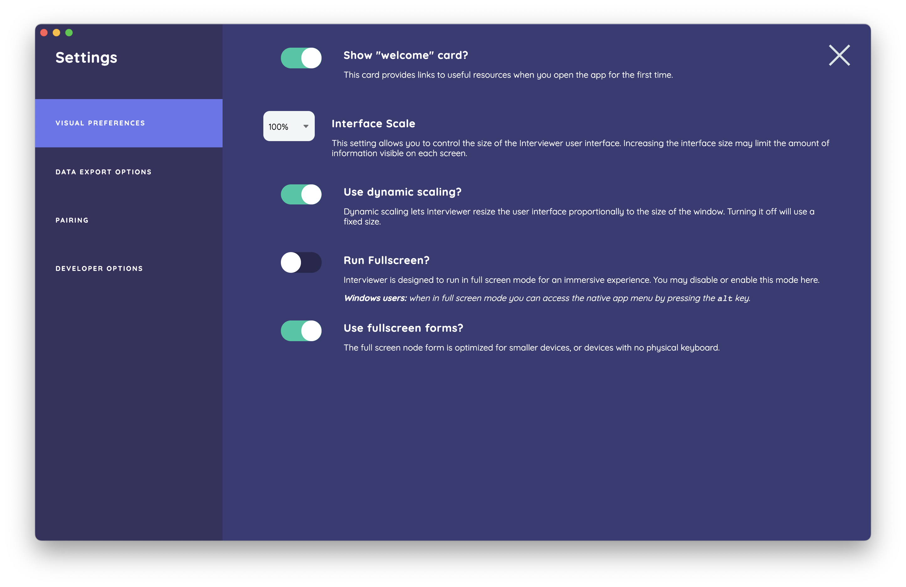 To scale all text and interface elements, increase or decrease the interface scale dropdown. By default, Interviewer automatically increases text size and spacing as its window size increases. To disable this behavior and set a static window size, turn off use dynamic scaling.