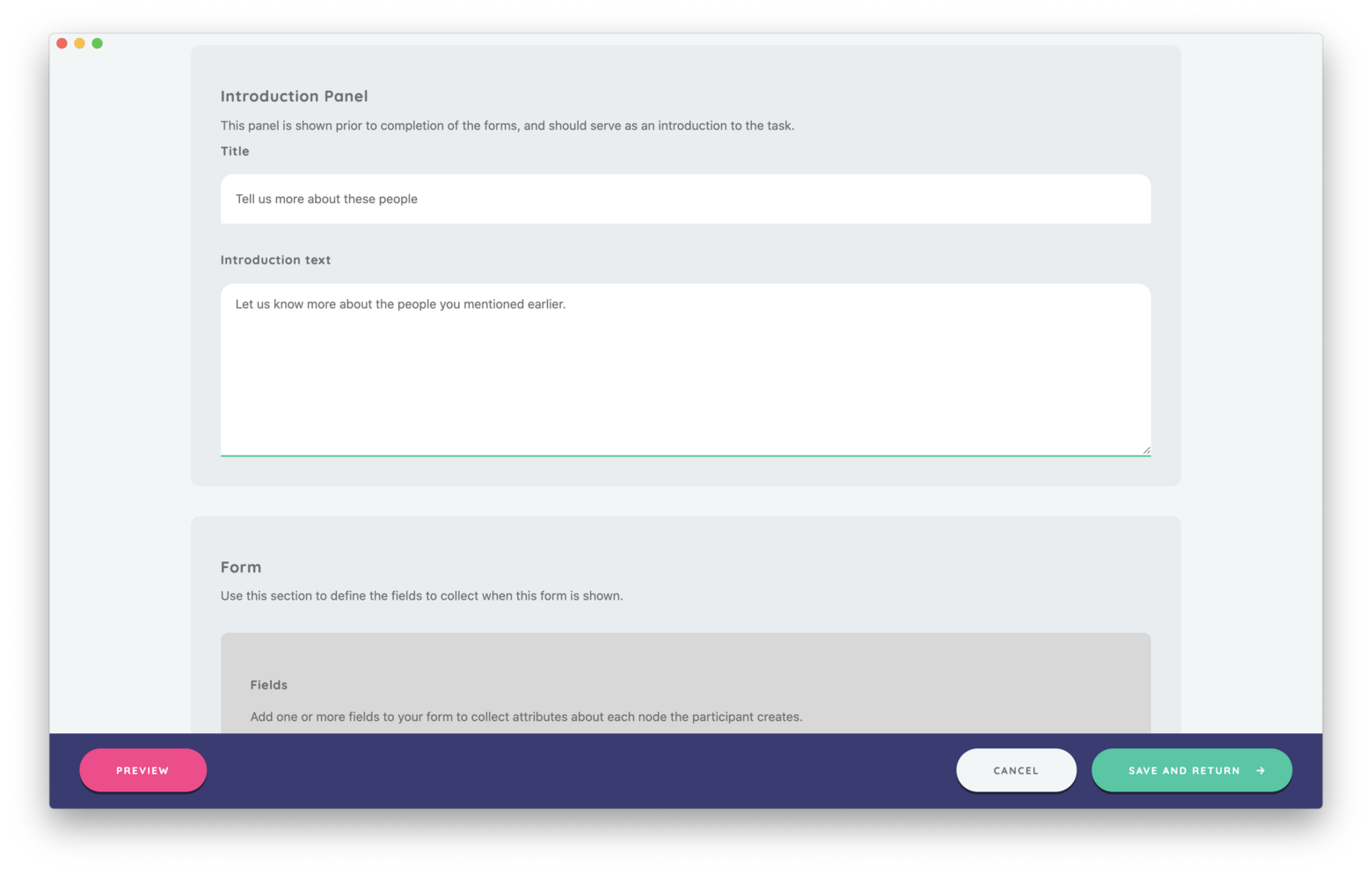 The Per Alter Form is a name interpreter interface that captures attribute data on the alters in a participant's network. When using the Per Alter Form, participants review an introductory panel which describes the tasks on the stage and then complete a form on each node in their network. These forms are customizable and can include one or multiple fields to collect specific attribute data using a variety of input controls.