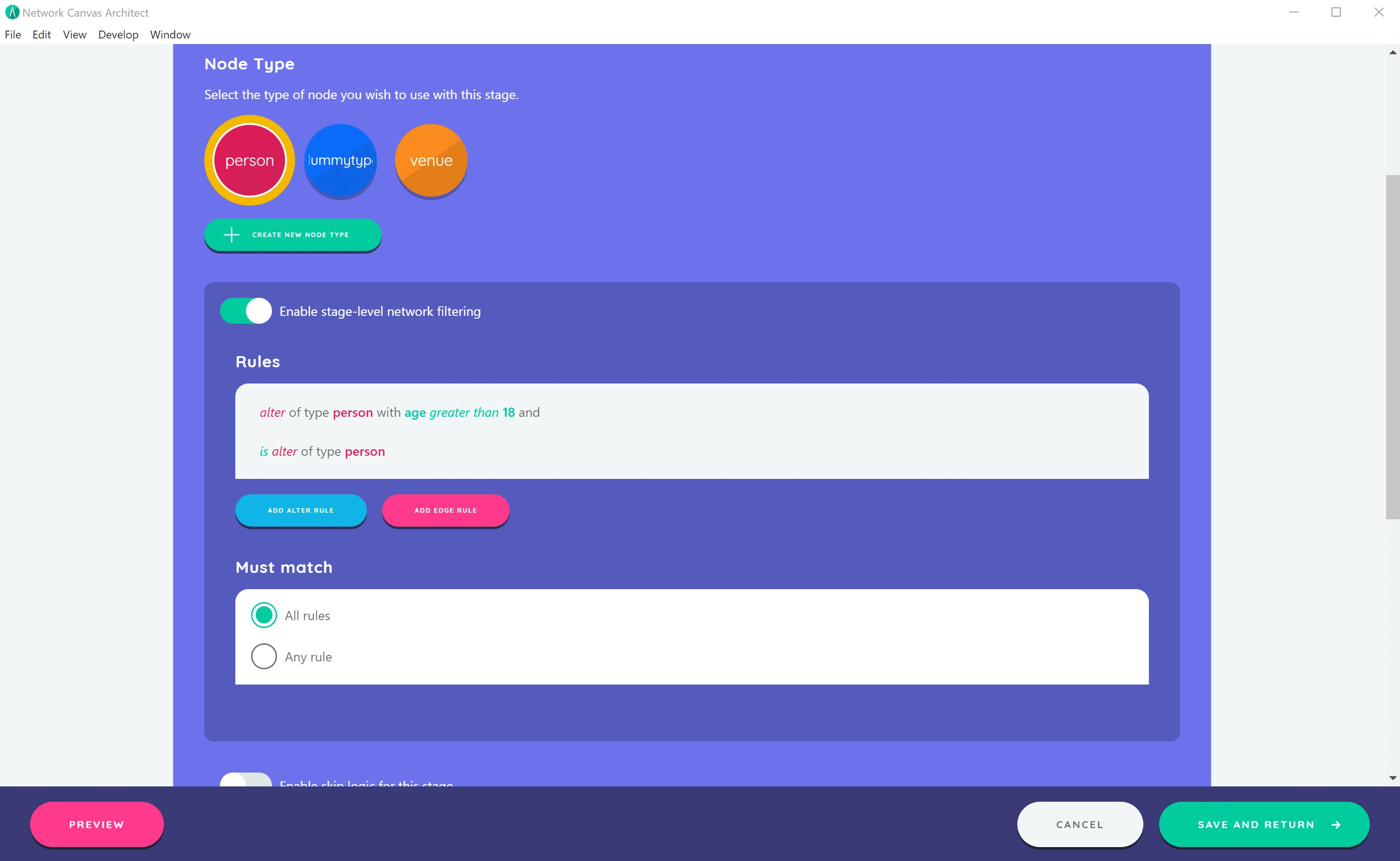 Similar to skip logic rules, filtering rules have two types that can be targeted at either nodes or edges: