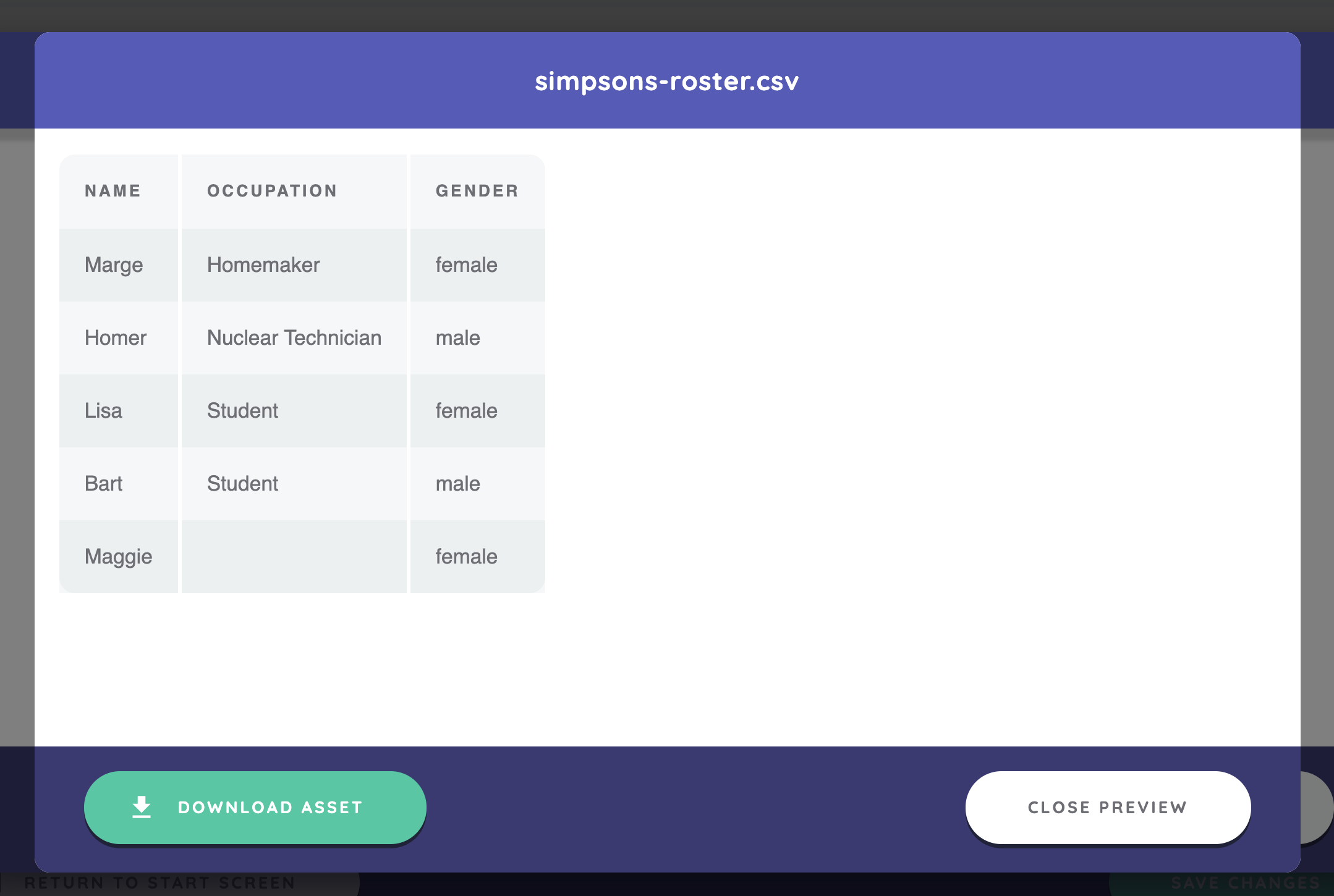 You can also add it when you are creating a roster name generator. Below we walk through the steps of adding it to a name generator and we will add the roster as we go along. We will use a simple roster which includes five members of the cartoon television show, "The Simpsons", but you should be able to follow by analogy for a roster of your own making. The example CSV is available here.