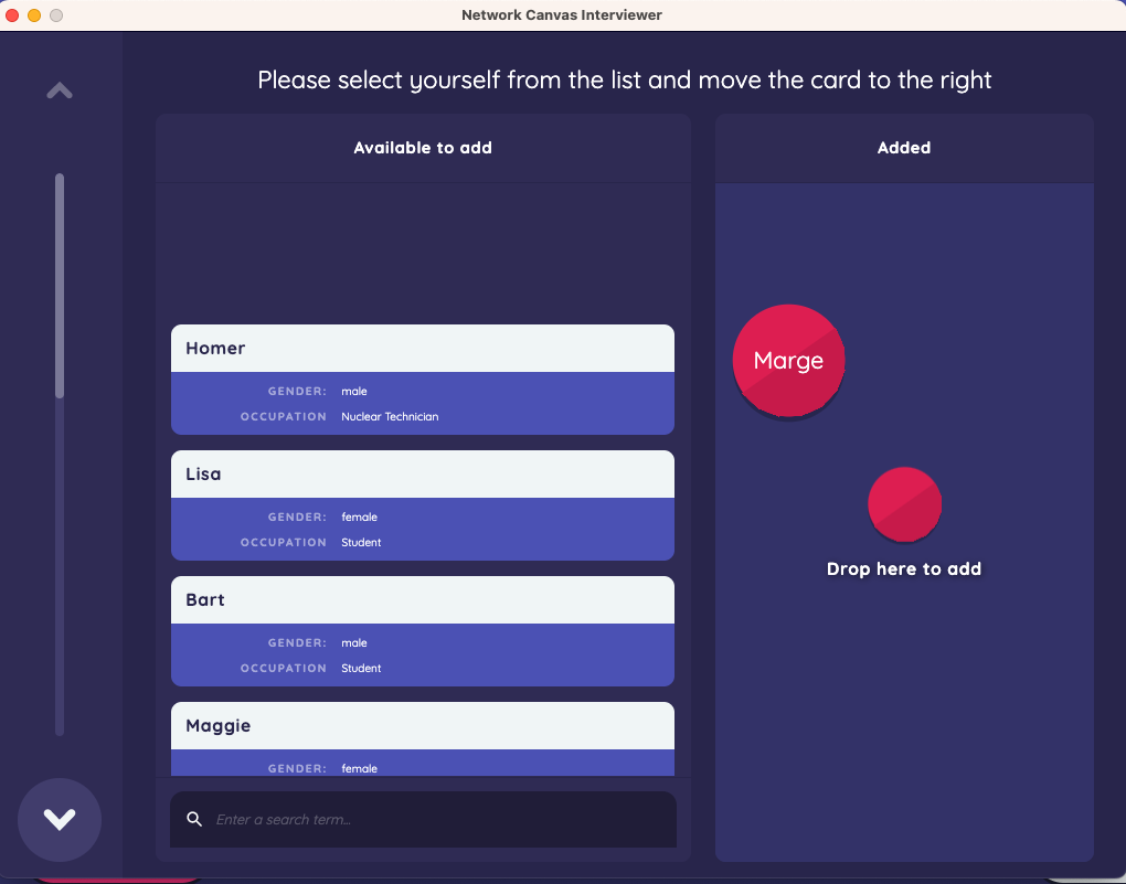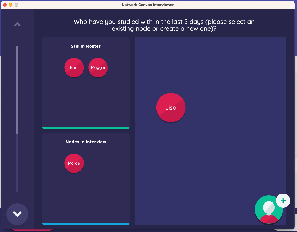 With a Name Generator (quick add), we can nominate new nodes with the new node button in the lower right. But on the left hand side we can have a side panel. In fact we can have two - one for people already nominated who are now in the alter pool and one for the remaining roster items who have not yet been nominated. Below is an example of such a screen with some of the Simpsons already nominated (in the alter pool) and some still in roster.