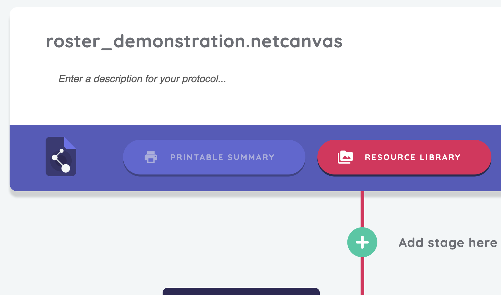 Once you are satisfied with your roster, you can add it to a Network Canvas protocol from within Architect. You can add it through the Resource Library, which is available by pressing the button at the top of any protocol you are editing.
