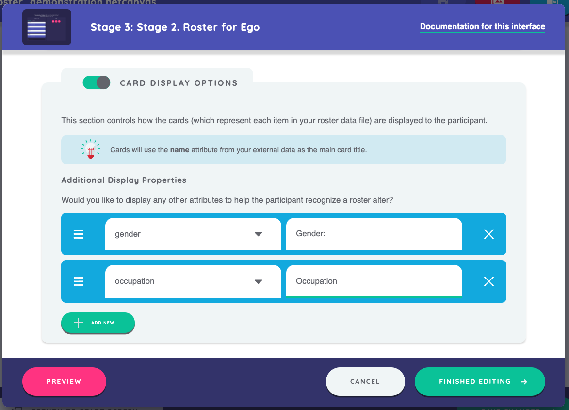 Since a roster might have a large number of people to scan, you can also enable the cards to be sorted by some value. So if we add occupation, then in the interview the participant can sort the roster by occupation.
