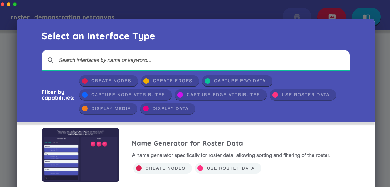 To use a roster, you should select the interface "Name Generator for Roster Data". Give the stage a name (such as roster_01) and then create or select a node type. In the example, we have created a node type called "person" and so we will choose this. Then the program asks for "Data Source for Roster". If you have already uploaded the CSV to the Resource Library it will be available to select. Otherwise, you can upload it now.